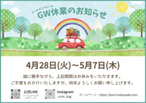 ゴールデンウィーク休業のお知らせ【 大阪実店舗 】 2026 4/21 お知らせ 2026年4月21日 大阪実店舗のゴールデンウィーク休業のお知らせです。 誠に勝手ながら、 4月28日(火)〜5月7日(木)の期間はお休みをいただきます。 ご不便をおかけいたしますが、何卒よろしくお願い申し上げます。 お問い合わせはこちら お知らせ この記事が気に入ったら フォローしてね! Follow Me よかったらシェアしてね! URLをコピーしました! 【2026年4月】大阪実店舗営業日のお知らせ 関連記事 2022~2023AWチュールバッグ新柄 2022年10月4日 【2024年7月】大阪実店舗営業日のお知らせ 2024年6月24日 大阪実店舗の年末年始休業のお知らせ 2024年12月20日 大阪市プレミアム付き商品券2022 2022年8月25日 2025 チュールバッグ 大サイズ 新柄 2025年4月22日 2025 お財布ポシェット 新柄 2025年4月14日 【2024年5月】大阪実店舗営業日のお知らせ 2024年4月24日 SWANY 中原淳一コラボⅢ が入荷しました 2024年2月20日